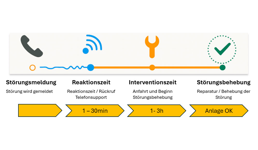 Entweder per Telefonsupport oder direkt vor Ort innerhalb der vereinbarten Interventionszeit. So minimieren wir Ausfallzeiten und sichern den kontinuierlichen Betrieb.